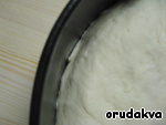 Подошедшее второй раз тесто раскатать кругом чуть больше формы и выложить сверху в форму, подворачивая край до дна формы.
