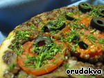 Пирог по вкусу можно украсить нарезанными кольцами маслин без косточек и посыпать верх зеленью.