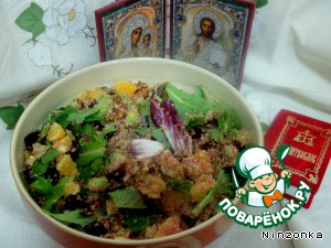 • Киноа залить водой. Когда вода закипит, уменьшить огонь и закрыть крышкой. Через 15-20 минут киноа готова. Снять с огня и дать остыть.
