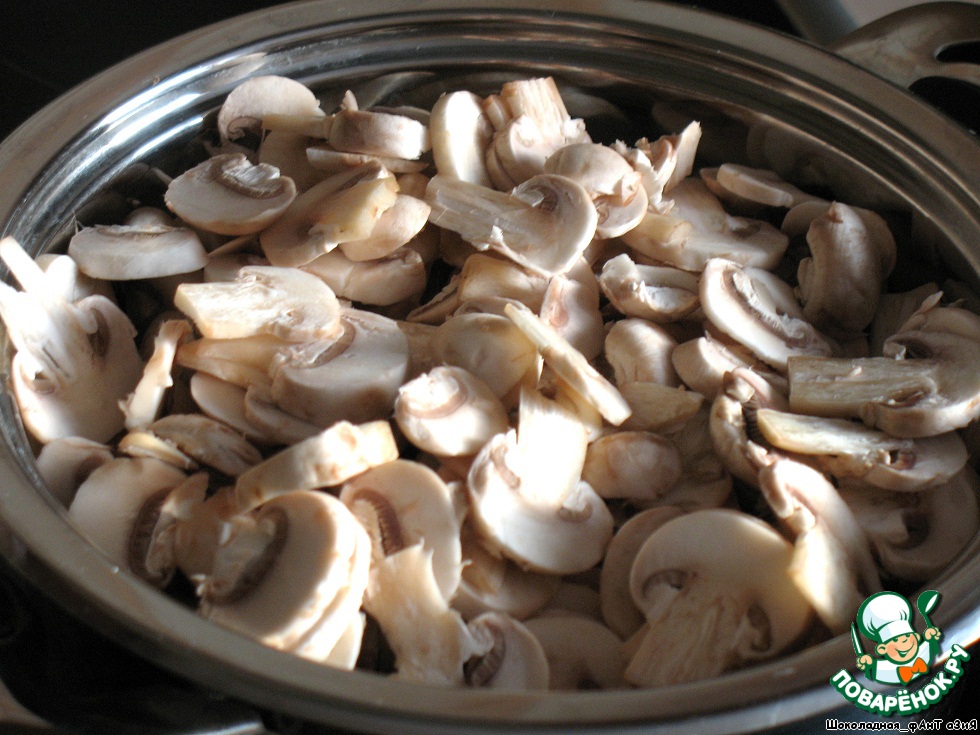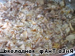 Поставить НЕ БОЛЬШУЮ кастрюлю на огонь, налить 50 мл. подсолнечного масла, положить нарезанные грибы, закрыть крышкой и потушить минут 8 (во время отваривания образуется жидкость, её не выливать, она нам еще будет нужна! У меня вышло 200 мл жидкости).