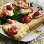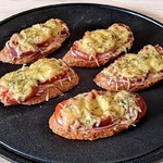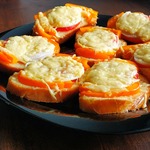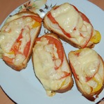 Количество продуктов не пишу, рассчитываем на свой противень. На противень смазанный растительным маслом выкладываем кусочки батона или багета.