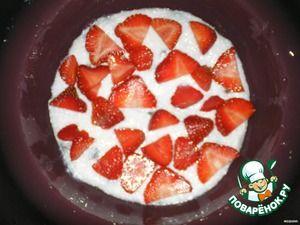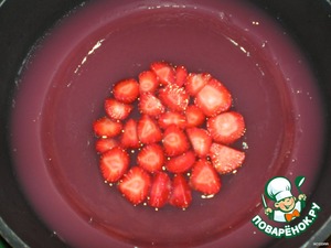 Формы с желе достаем, выливаем холодную воду, заполняем горячей. Даем немного постоять и убираем меньшую форму. На дно формы выкладываем половинки клубники. Оставшуюся клубнику режим дольками.