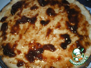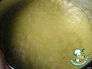 Затем раскатать диаметром с нашу большую форму, выложить на противень, проткнуть вилкой и выпечь в разогретой духовке 10 мин.