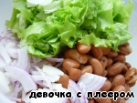 Лук нарезать тонкими полукольцами. Добавить к фасоли.