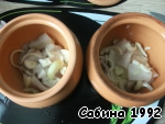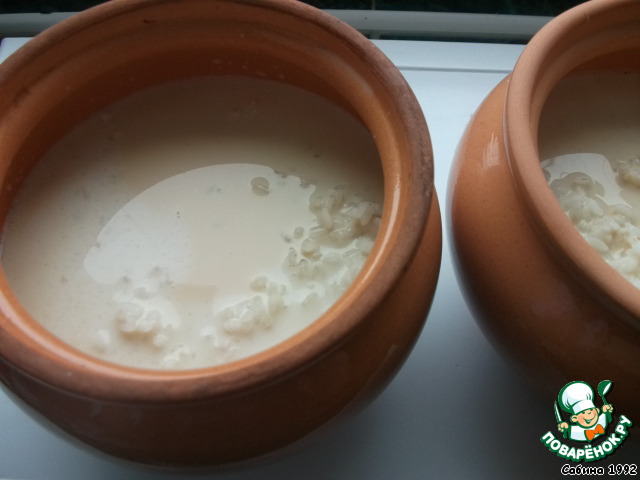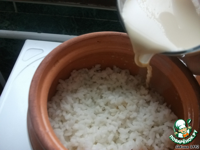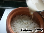 Залить "соус" в горшочки. "Соус" должен быть на уровень выше риса, но не доходить да края горшочка. -