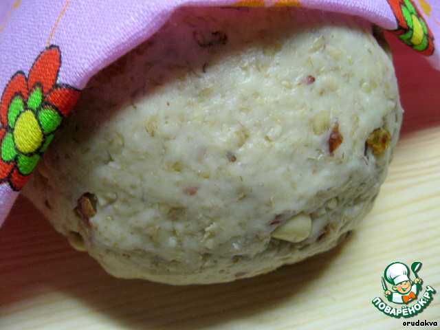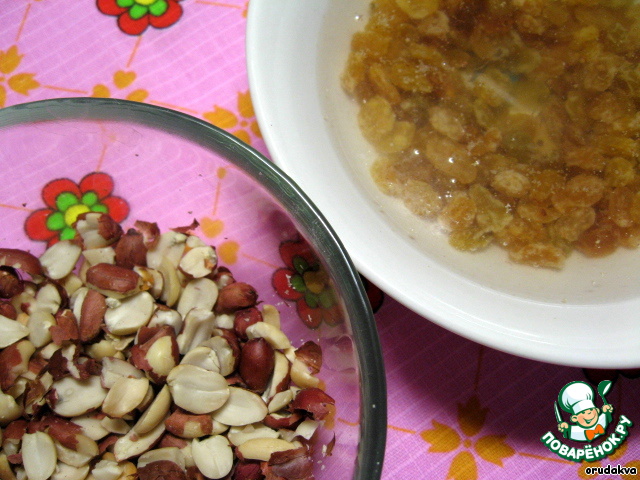 Изюм зальем водой, орехи измельчим, но не мелко. Я просто положила в пакет и прокатала скалкой. -