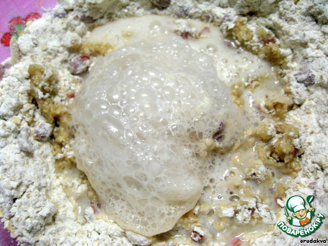 В миске соединим 150г просеянной муки, 100г отрубей (у меня овсяные, но подойдут любые), 2ст. л. сахара и щепотку соли. Добавим орехи. Перемешаем.