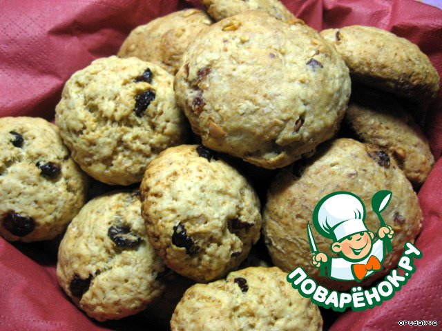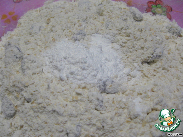 150г просеянной муки соединим со 100г отрубей, 2ст. л. сахара, 1ч. л. разрыхлителя, щепоткой соли, перемешаем. -