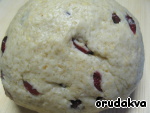 Постепенно введем тёплую воду (около 70мл). Изюм откинем на дуршлаг и добавим к тесту. Замесим мягкое, не липнущее к рукам тесто. Если надо, добавим немного муки.