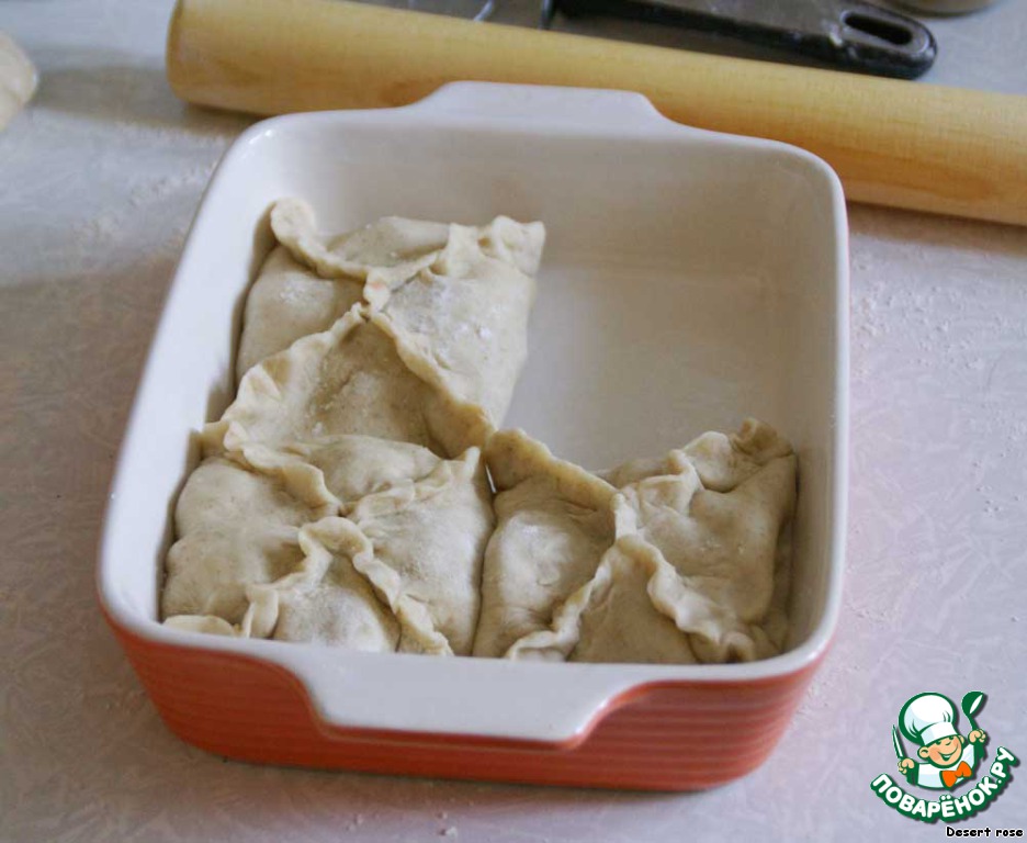 Внутрь каждого квадрата положить начинку. Защипнуть диагонально противоположные квадратов - получится малый квадрат. И тщательно защипать края теста, чтобы спрятать всю начинку.