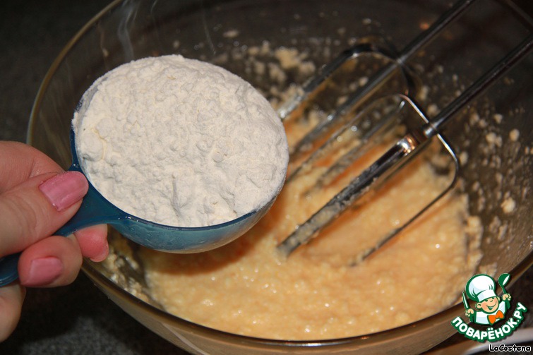 Добавить 100 г муки и немного разрыхлителя.