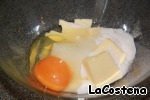 Взбить сахар, сливочное масло и яйца.