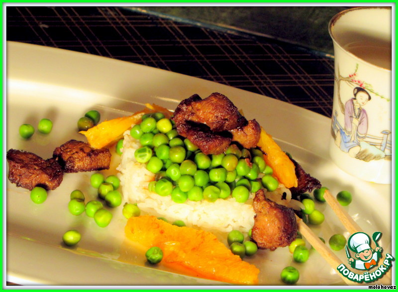 Отварить рис и зеленый горошек, смешать их. Печень (я всегда предварительно замачиваю ее в молоке) порезать на небольшие кусочки. Обжарить, поливая соевым соусом.