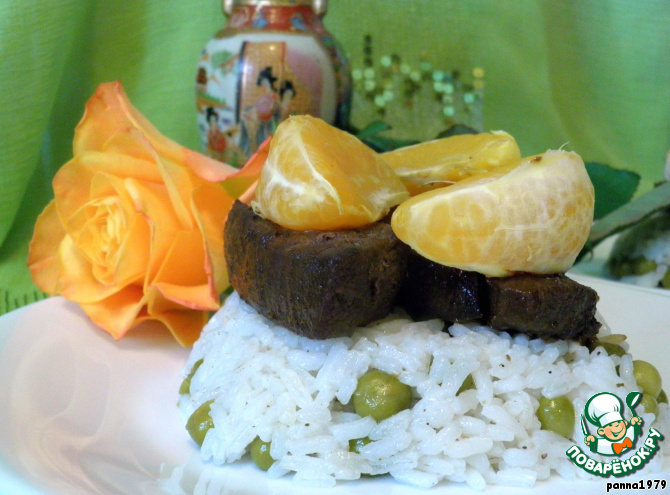 Подавать, выкладывая на тарелку слоями: рис, печень, мандарины.