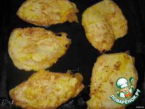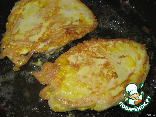 • Яйца разбить в чашку, посолить. Куриное филе обмакнуть в яйца.