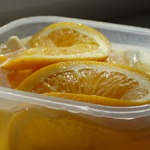 Берем банку (у меня 0.5 л, на эту банку у меня ушло чуть больше, чем 1.5 апельсина), стерилизуем ее (или обдаем кипятком) и укладываем в нее кусочки апельсина. Но только не очень плотно, т.к. в готовом виде не очень удобно буде вынимать.