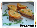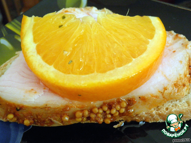 3. Очень вкусно кусочки апельсина выложить на запеченную куриную грудинку. А грудинку, в свою очередь, на кусочек черного хлебушка. Это единственное фото, которое я сделала с использованием апельсина.