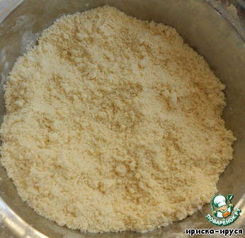 Теперь, пока начинка остывает, готовим тесто. Смешиваем муку и масло, до образования крошки.