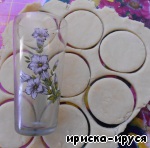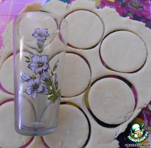 Раскатываем тесто, не тонко. Вырезаем кружочки при помощи стакана.