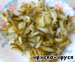 Соломкой режем огурчики, мелко крошим луковицу. Соединяем огурчики и лук и обжариваем на сковороде с небольшим количеством растительного масла.