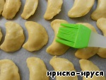 Выкладываем пирожки на лист, застеленный пекарской бумагой, обмазываем их белком. Из данного количества теста получается 1 лист пирожков.
