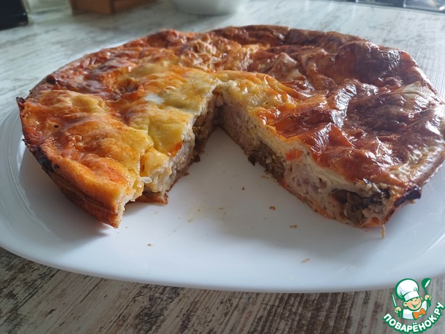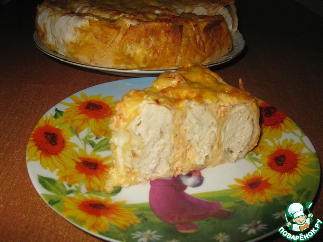 Заливаем пирог, стараясь заполнить все промежутки между рулетиками, и отправляем в разогретую до 200-220 градусов духовку. Готовим до румяной корочки примерно 35-40 минут, все зависит от вашей духовки.
