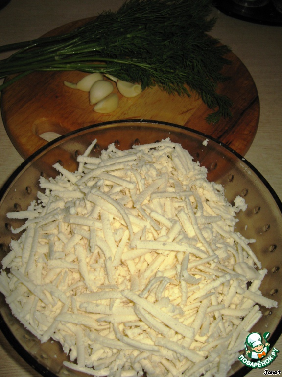 Сыр натереть на крупной тёрке, почистить чеснок.