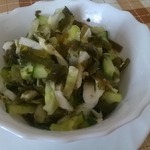 Белокочанную капусту тонко нашинковать (я это сделала овощечисткой), посолить и перемешать, если же Вы нарезали ножом, то можно немного посолить и помять руками. Добавить к морской капусте.