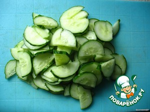 Огурец режем вдоль крест-накрест, потом рубим поперек тонкими пластинками.