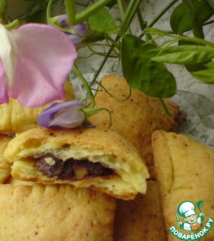 Затем вырезать из теста квадраты, добавить начинку, у меня это белый и темный шоколад. Еще можно взять любое варенье или джем.