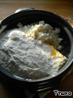 Смешать масло, желток, творог, соль и муку и замесить гладкое тесто.