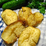 • Раздавить картофель (придавив блюдцем, например), можно его развернуть и "раскрыть" или оставить просто раздавленным.