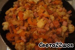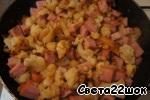 Когда капуста немного подрумянится, добавить нарезанный кубиками лук и ветчину.