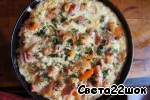 Яйца взбить с солью. Полученной яичной массой покрыть овощи в сковороде и накрыть крышкой. Дать немного постоять на медленном огне. Украсить зеленью. И... омлет готов!!! Приятного аппетита!!! Экспериментировать над этим блюдом можно до бесконечности. Без мяса, кстати, тоже очень вкусно!
