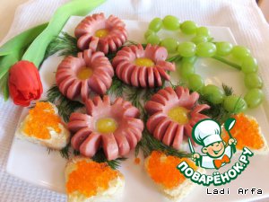 Выложил "цветочки" из сосисок на свежие веточки укропа и украсил блюдо "сердечками" с икрой.
