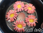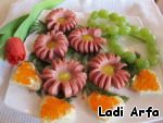 Выложил "цветочки" из сосисок на свежие веточки укропа и украсил блюдо "сердечками" с икрой.