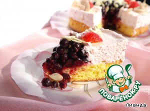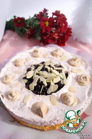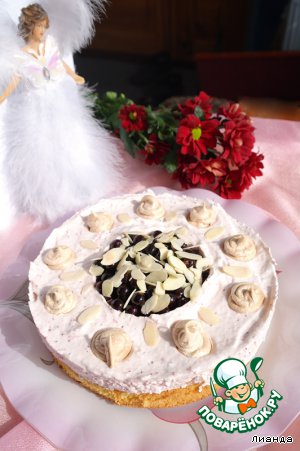 Через некоторое время торт аккуратно достать из формы. Украсить маленькими безе, миндальными лепестками, клубникой.