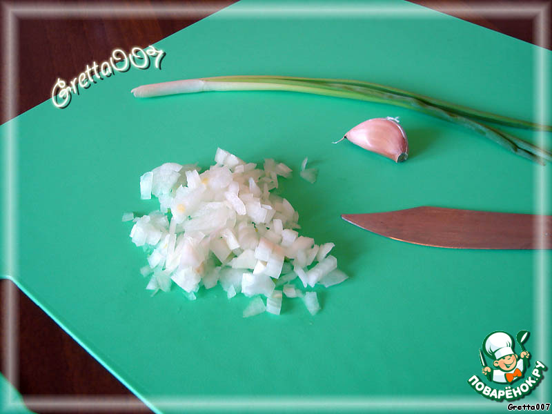 Репчатый лук подрумяниваем на сухой сковороде (в воскресенье можно использовать и ложечку растительного масла ;-) ). Добавляем к луку чеснок.