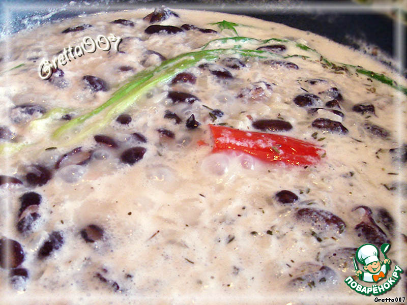 К луку и чесноку добавляем рис, фасоль, перец, зеленый лук, тимьян, соль, кокосовое молоко и воду.