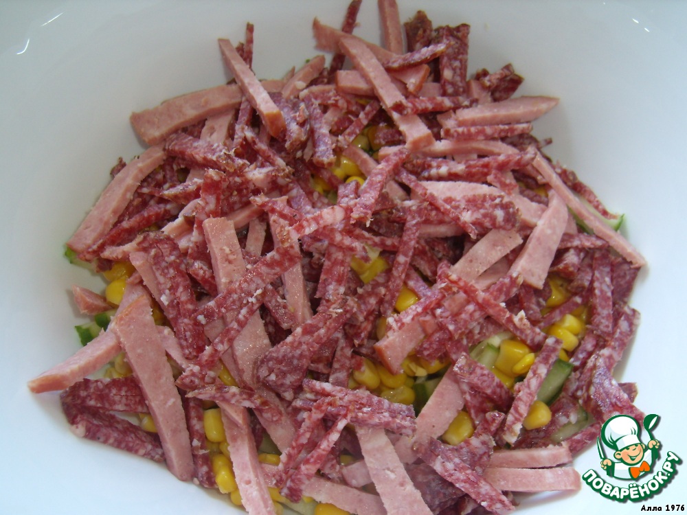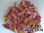Два вида колбасы нарезать соломкой (можно заменить копченым окорочком).
