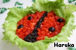 Из оливок выкладываем мордочку и пятнышки божьей коровки, а мелко нарезанным красным болгарским перцем заполняем оставшееся туловище коровки. Салат готов. Приятного аппетита