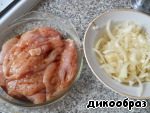 Нарезаем грудку пластами, отбиваем и маринуем в соевом соусе минут 30. Нарезаем лук. Заливаем его уксусом, перемешиваем.