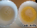 В желтки добавить по щепотке карри и сахара, взбить с 2 чайными ложками воды.