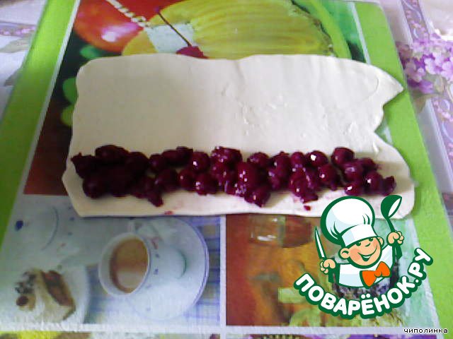 На длинную сторону коржа выложить вишню.