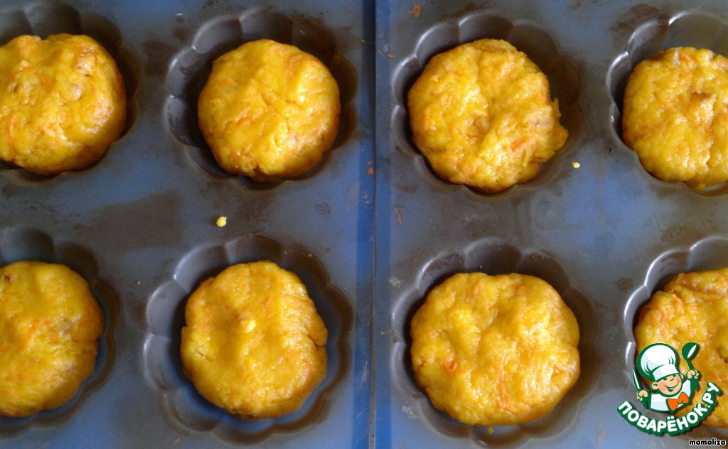 Тесто разделить на 12 частей, скатать колобки и разложить в формочки для кексов.