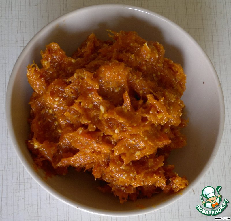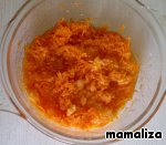 Морковь очистить, натереть на мелкой терке. Тертой моркови должен получиться 1 стакан. Смешать с сахаром, разрыхлителем, растительным маслом.
