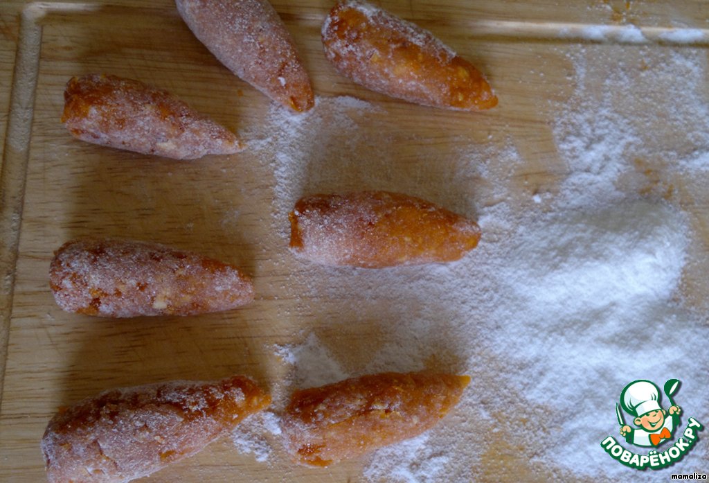 А теперь небольшое лирическое отступление. Моему внуку 1 год и 1 месяц. Когда сын сообщил, что он ходит в школу юных гениев, я была в шоке. Как можно заставить моего абсолютно самостоятельного и независимого внука спокойно сидеть, слушать, или что-то делать? На одном из первых уроков он слепил морковку! Спрашиваю сына, насколько должны быть талантливыми педагоги, чтоб заставить годовалого ребенка лепить? Мам, да все просто, отвечает сын. Ему в ручку положили кусочек оранжевого пластилина, слегка сжали ручку, морковка готова! (Я только догадываюсь, сколько стоят такие занятия). Мы уже люди взрослые и, очевидно, не гении. Но морковку таким способом сумеем сделать. Не правда ли? Итак, берем небольшой кусочек полученной пасты и с помощью сахарной пудры и руки формируем морковку.