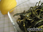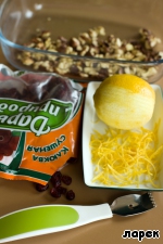 Тем временем вымыть лимон с мылом, обдать кипятком, снять с него цедру. Из трети лимона выдавить сок. Грецкие орехи очистить и слегка поджарить (я поставила их в духовку рядом с фасолью на 5 минут - до легкого румянца и запаха).