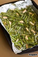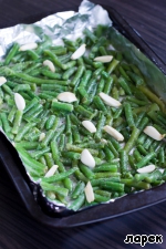 Включить духовку на 230 градусов. Форму застелить фольгой, высыпать стручковую фасоль. Полить маслом, перемешать руками, так, чтобы вся фасоль оказалось смазанной маслом. Посыпать солью, сахаром (лучше коричневым), свежесмолотым черным перцем, положить зубчики очищенного чеснока, разрезанные наполовину. Поставить в духовку на 10 минут.