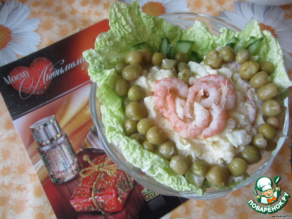 Смешать креветки (штук 5-7 отварных креветок оставляем для украшения салата), картофель, яйцо и сыр. Заправить майонезом и посолить по вкусу.